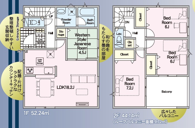 | 設備 | 設計住宅性能評価書、建設住宅性能評価書(新築時)、市街地が近い、整形地、平坦地、2階建、LDK15畳以上、和室、スマートキー、床下収納、システムキッチン、対面式キッチン、IHクッキングヒーター、浄水器、浴室乾燥機、浴室1坪以上、オートバス、浴室に窓、シャワー付洗面化粧台、トイレ2ヶ所、温水洗浄便座、ワイドバルコニー、庭、複層ガラス、駐車3台以上可、セキュリティ充実、TVモニタ付インターホン、即引渡可 | ||